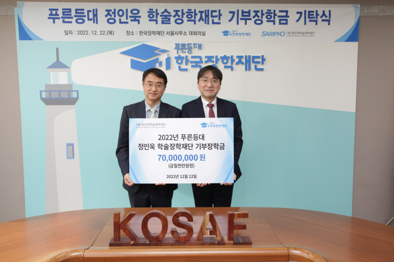 2022 한국장학재단 푸른등대 기부장학금 기탁식 2025-07-09 0 266 07.09 14:39 지난 2022년 12월 22일, 정인욱학술장학재단은 자립준비청년 대학생들을 위한 장학금을 지원하기 위해 한국장학재단에 기부장학금을 기탁하였습니다. 전달 된 기부장학금은 한국장학재단을 통해 선정 된 자립준비청년 대학생들에게 전달하기로 하였습니다.