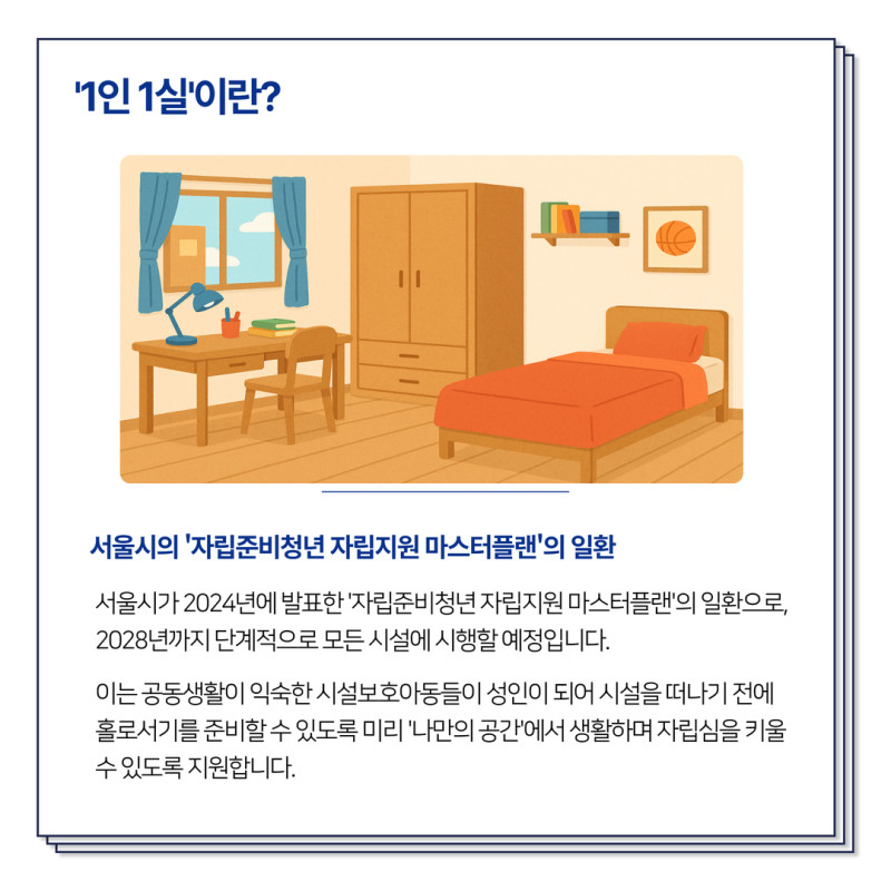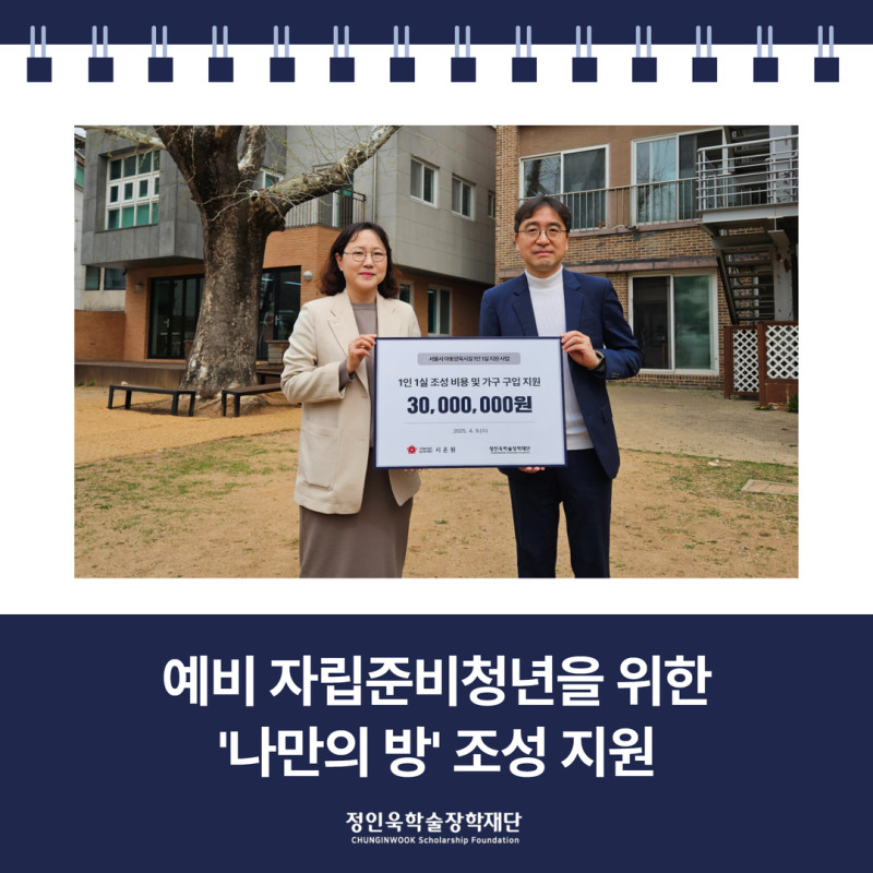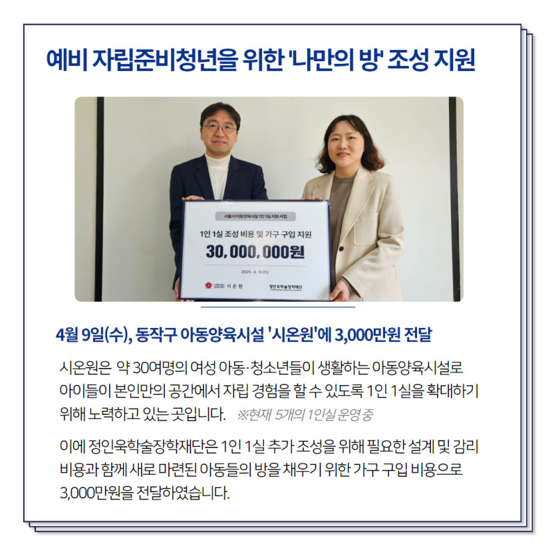 [카드뉴스]예비 자립준비청년을 위한 '나만의 방' 조성 지원 최고관리자 2025-07-09 최고관리자 0 398 07.09 15:28 정인욱학술장학재단은 서울시 아동양육시설 1인 1실 지원 사업의 일환으로, 지난 4월 9일에 아동양육시설 '시온원'을 방문하여 1인 1실 조성을 위한 설계 및 감리비, 가구 구입비 3,000만원을 전달하였습니다. 앞으로 아동양육시설에서 아이들이 본인만의 공간에서 자립 경험을 할 수 있기를 응원하겠습니다.