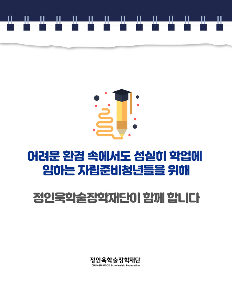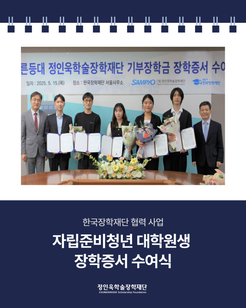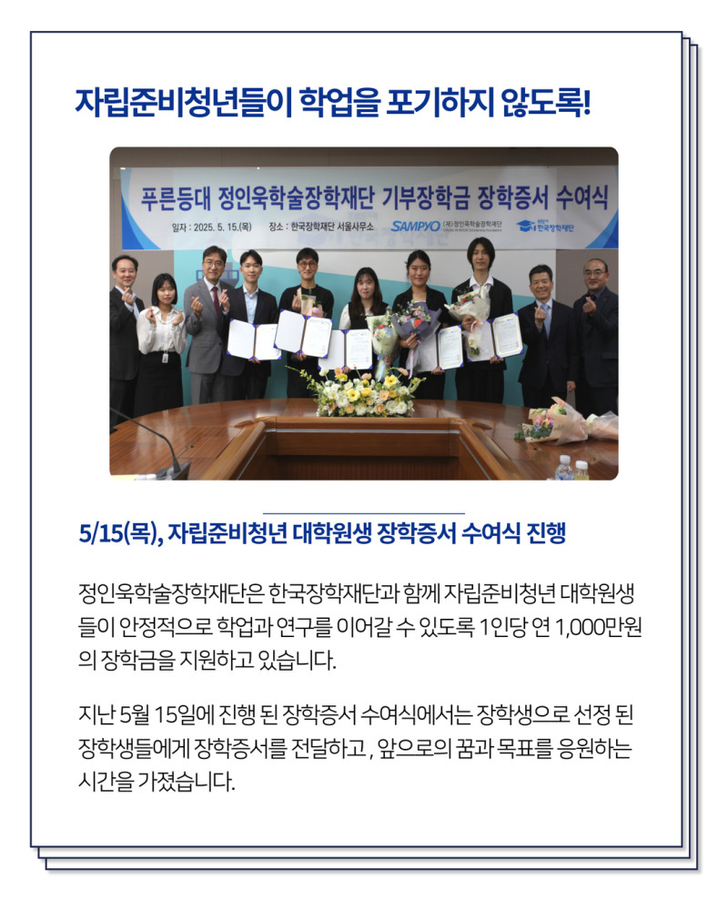 [카드뉴스]2025 한국장학재단 푸른등대 기부장학금 장학증서 수여식 최고관리자 2025-07-09 최고관리자 0 416 07.09 15:36 정인욱학술장학재단은 한국장학재단과 협력하여 자립준비청년 대학원생을 위한 장학금을 지원하고 있습니다.지난 5월 15일, 장학생으로 선정된 자립준비청년 대학원생들과 함께 장학증서 수여식이 진행되었기에 그 소식을 공유합니다.